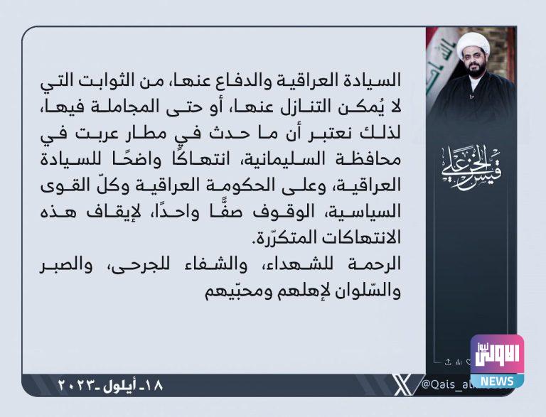 فيما أشار الأمين العام لعصائب أهل الحق، قيس الخزعلي، الى أن “السيادة العراقية والدفاع عنها من الثوابت التي لا يُمكن التنازل عنها، أو حتى المجاملة فيها”.
