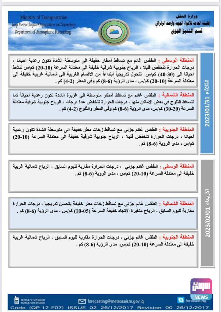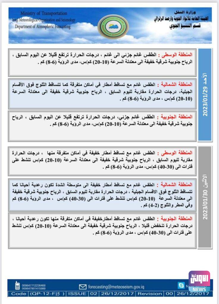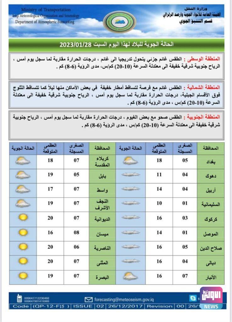 وذكر بيان للهيئة، تلقته (الاولى نيوز)، أن “طقس البلاد لهذا اليوم السبت في المنطقة الوسطى سيكون غائماً جزئياً ويتحول تدريجياً الى غائم، فيما سيكون الطقس في المنطقة الشمالية غائماً مع فرصة لتساقط أمطار خفيفة في بعض الأماكن منها ليلا كما تتساقط الثلوج فوق الأقسام الجبلية، أما المنطقة الجنوبية فالطقس سيكون صحواً مع بعض الغيوم، ودرجات الحرارة مقاربة لما سجل يوم أمس في جميع مناطق البلاد”، مبيناً أن “درجات الحرارة العظمى في بغداد وكربلاء المقدسة 18، والنجف الأشرف والبصرة وبابل 19، وأربيل والموصل 14، والسليمانية 10، والديوانية والناصرية والمثنى 20”.