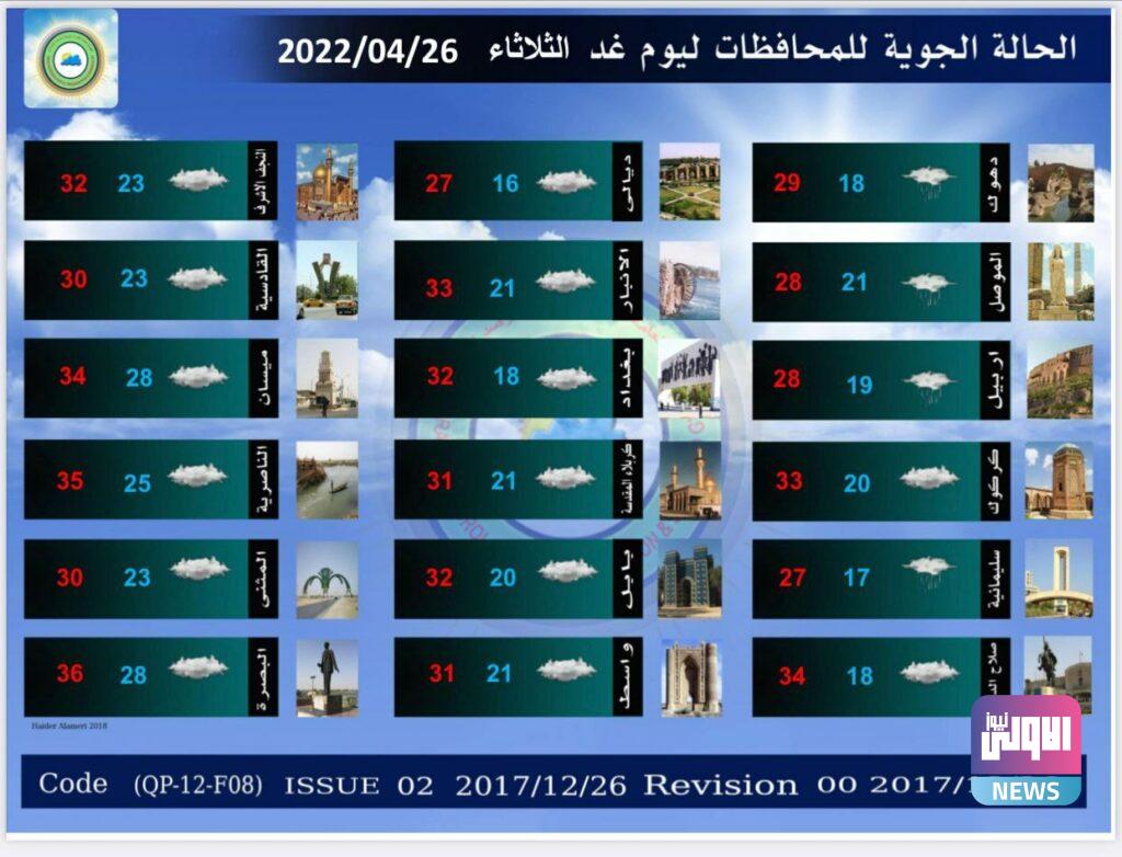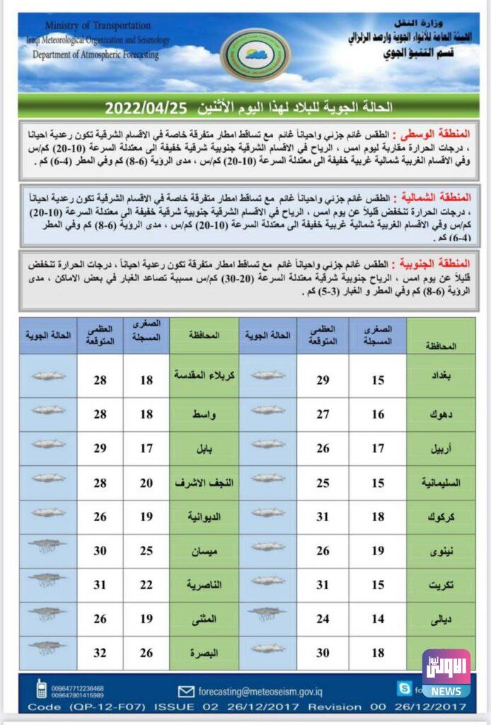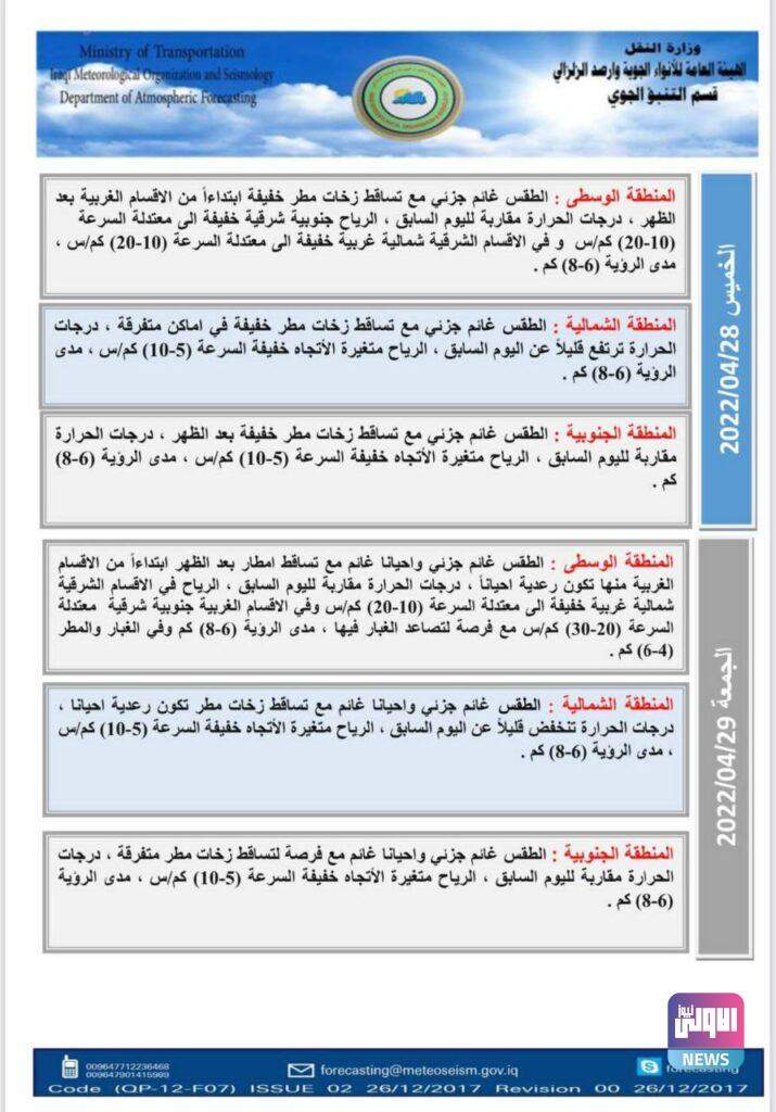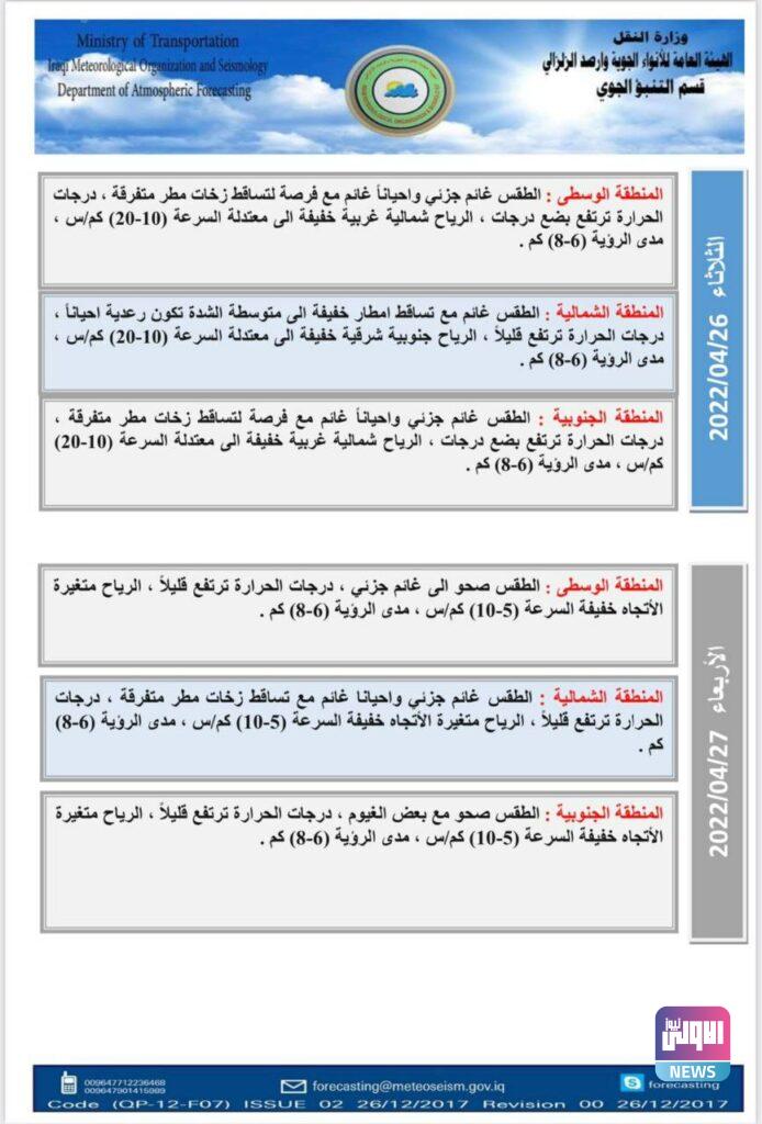 وأضاف البيان، أن “طقس يوم الأربعاء سيكون صحواً الى غائم جزئي في المنطقة الوسطى، بينما سيكون طقس المنطقة الشمالية غائماً جزئياً واحياناً غائماً مع تساقط زخات مطر متفرقة ، فيما سيكون طقس المنطقة الجنوبية صحواً مع بعض الغيوم ، أما درجات الحرارة فسترتفع قليلاً بعموم البلاد”.