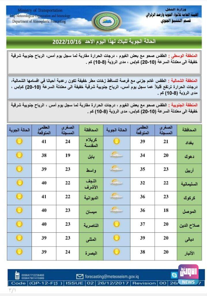 وأدناه جدول بدرجات الحرارة ليوم غد الاثنين وحالة الطقس للأيام المقبلة بحسب ما نشرته هيئة الأنواء الجوية: