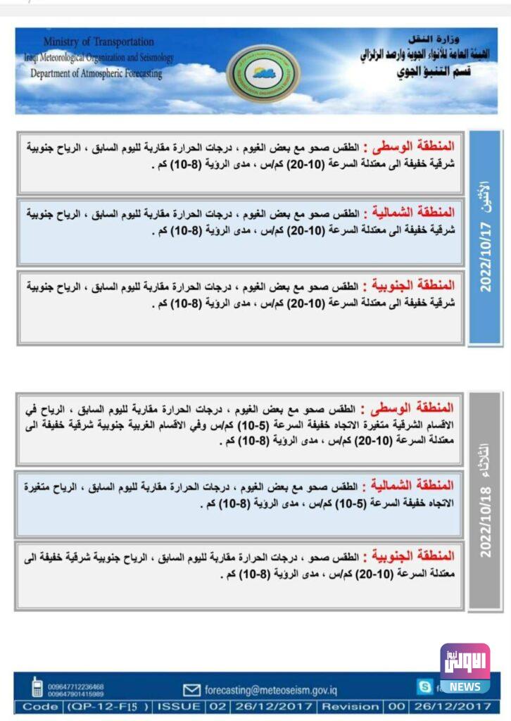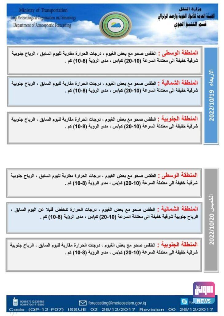 وأوضح أن “طقس يوم الأربعاء سيكون صحواً مع بعض الغيوم ، ودرجات الحرارة تكون مقاربة لليوم السابق في جميع مناطق البلاد”.