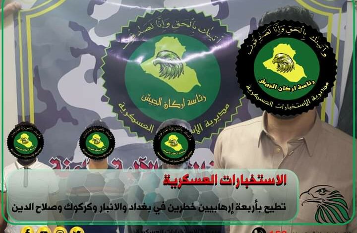 وأضاف البيان، أن “الإرهابيين بينهم يعملون بصفة ممول مواد غذائية وصحية وآخر موزع كفالات الى عائلات عناصر عصابات داعش الإرهابية”، لافتاً الى أنه “جرى تسليمهم إلى الجهات المعنية أُصولياً”.
