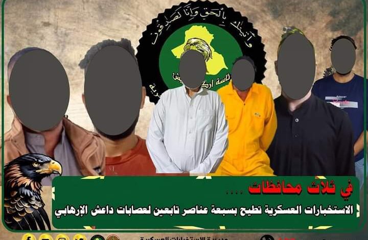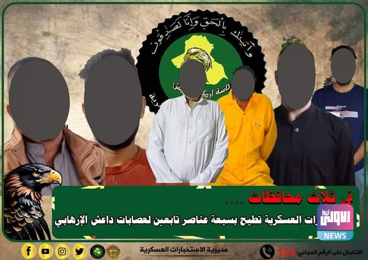 أعلنت مديرية الاستخبارات العسكرية، اليوم الأحد، الإطاحة بسبعة عناصر تابعين لعصابات داعش الإرهابية في ثلاث محافظات.