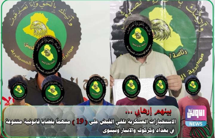 أعلنت مديرية الاستخبارات العسكرية، اليوم الأحد، عن القبض على 19 متهماً في أربع محافظات.