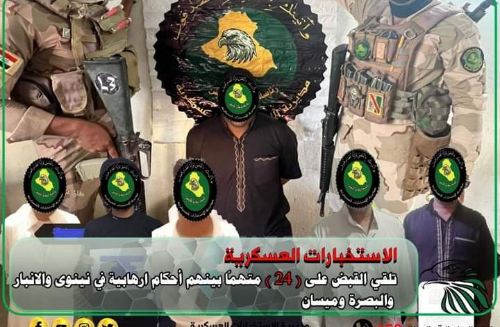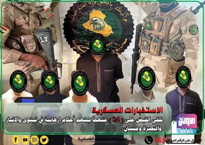 أعلنت مديرية الاستخبارات العسكرية، اليوم الاثنين، القبض على 24 متهماً بينهم أحكام ارهابية بأربع محافظات.