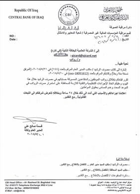 امهل البنك المركزي العراقي الشركة العالمية للبطاقة الذكية “كي كارد”24 ساعة لدفع رواتب الموظفين والمتقاعدين الممسوكة رواتبهم في مصرف الرشيد.