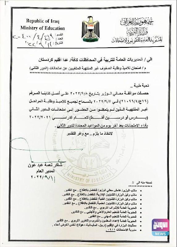 وذكر بيان للوزارة تلقته (الاولى نيوز)، انه “تقرر السماح لجميع تلاميذ وطلبة المراحل غير المنتهية الذين لم يتمكنوا من الحضور الى امتحانات الدور الثاني بـ(درس أو درسين فقط) للعام الدراسي 2021 – 2022، بأداء الامتحانات بعد آخر يوم من المواعيد المحددة للدور الثاني” .