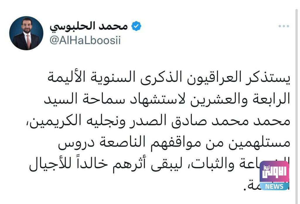 وقال الحلبوسي في تغريدة تابعتها (الاولى نيوز)، إن “العراقيين يستذكرون الذكرى السنوية الأليمة الرابعة والعشرين لاستشهاد محمد محمد صادق الصدر ونجليه الكريمين”.