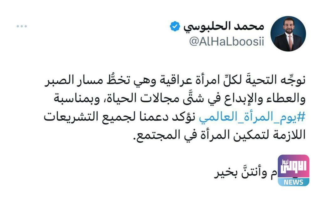 وقال الحلبوسي في تغريدة على تويتر تابعتها (الاولى نيوز)، “نوجِّه التحيةَ لكلِّ امرأة عراقية وهي تخطُّ مسار الصبر والعطاء والإبداع في شتَّى مجالات الحياة”.