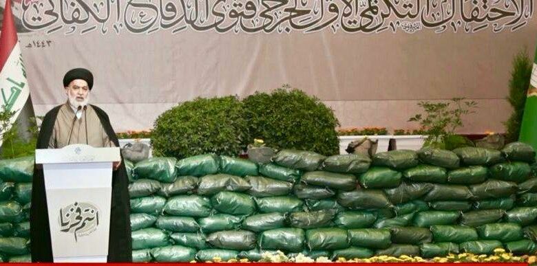 ونوه ان : “الذين لا يرضون بفعلكم فكفاكم انت الأعزة وهم الاذلة وانتم الكرامة وهم غير الكرامة وانتم الفخر والشرف”، مشيرا الى ان: “العراق مملوء على مر السنين من دماء تنزف، واليوم هذه الخارطة عادت بيضاء بفضل الدماء الزكية ولولا هذا الاصرار العنيف منكم لما عادت الحياة لهذا البلد ولولاكم لتحول العراق الى مناجم من جماجم، وانتم غيرتم معالم الواقع باستجابتكم وصمودكم واسستم لرؤية جديدة”.