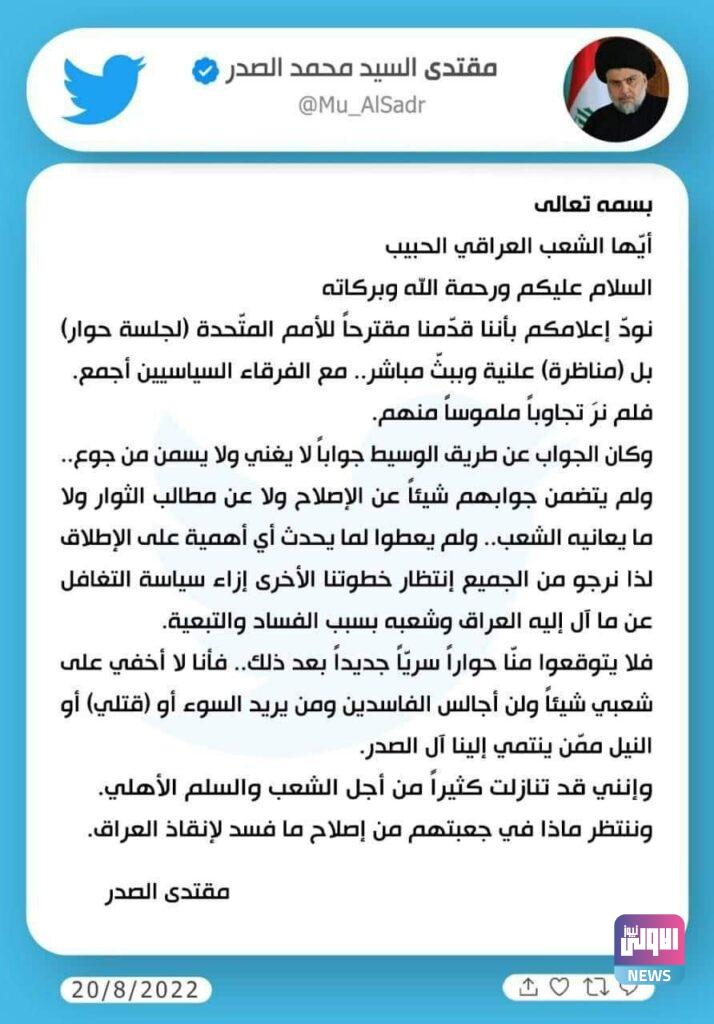 وقال الصدر في تغريدة له تابعتها (الاولى نيوز): “ايها الشعب العراقي الحبيب، السلام عليكم ورحمة الله وبركاته، نود اعلامكم بأننا قدمنا مقترحا الى الامم المتحدة (لجلسة حوار) بل (مناظرة) علنية وببث مباشر، مع الفرقاء السياسيين أجمع فلم نر تجاوبا ملموسا منهم”.