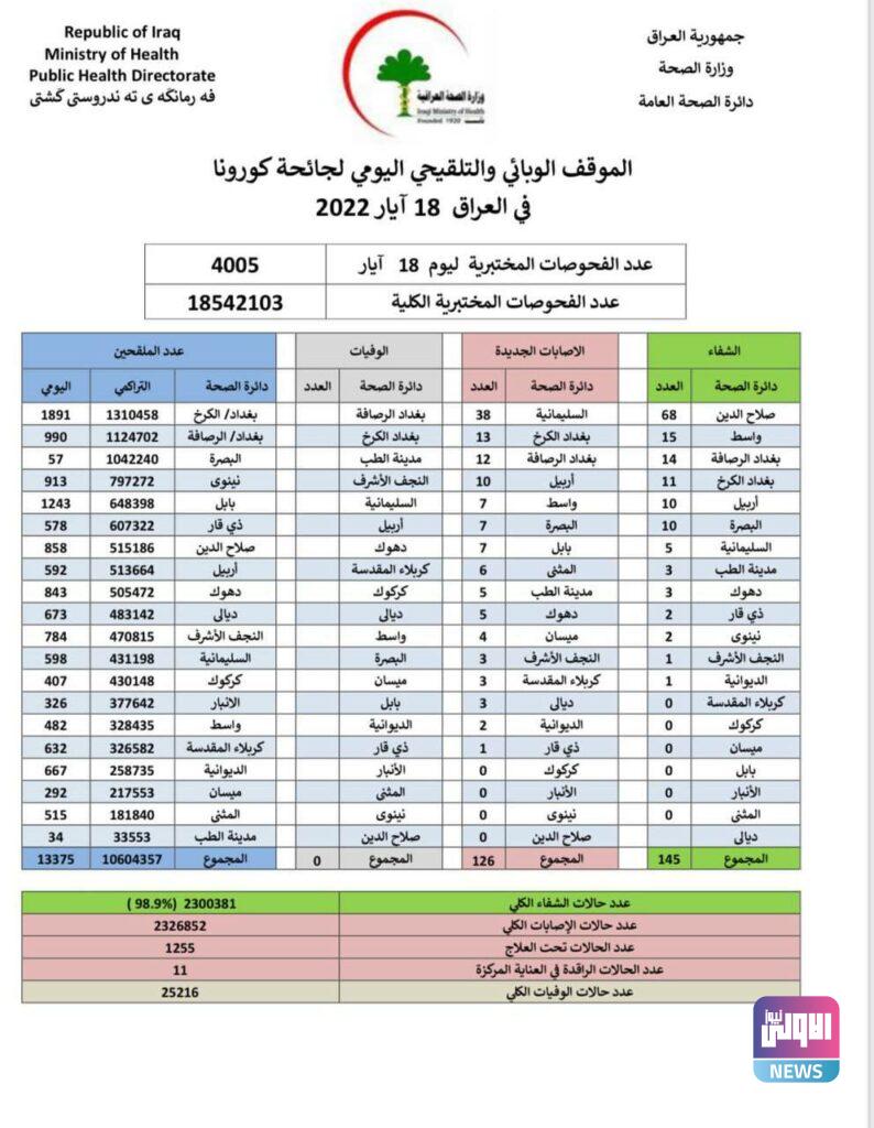وأضاف البيان، أن “الوزارة لم تسجل اي حالة وفاة بكورونا بعموم المحافظات”، لافتا إلى أن “الاشخاص الذين تلقوا اللقاح خلال 24 ساعة بلغ عددهم 13375”.