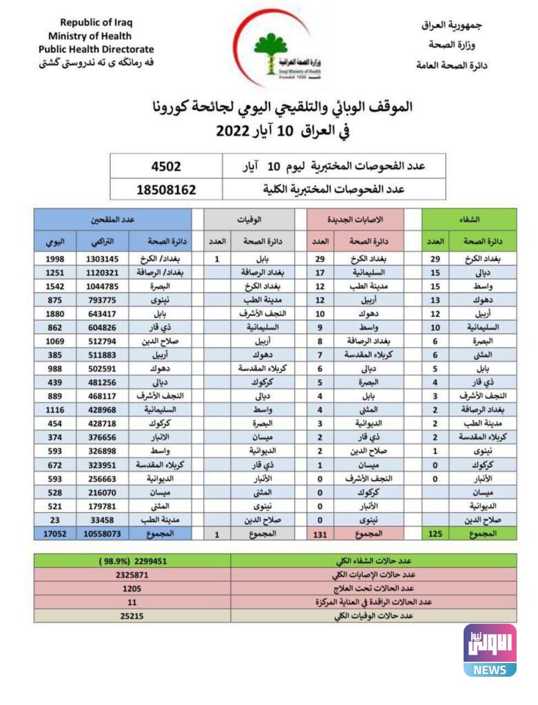 وذكرت الوزارة، في بيان تلقته (الاولى نيوز)، أنها “سجلت 131 إصابة جديدة بفيروس كورونا، وتماثل 125 شخصا للشفاء”.