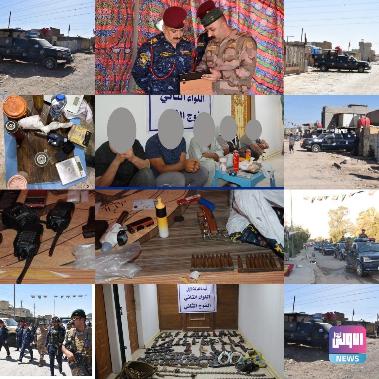 عملية تفتيش واسعة ضمن منطقة (الاستكشافات النفطية) شرقي بغداد ، أسفرت عن القبض على 5 متهمين ضُبط بحوزتهم كمية مادة الكرستال المخدرة ، 3 قناني غاز ، بندقية كلاشنكوف ، 4 بايب زجاجي ، 2 ميزان الكتروني ، مبلغ من المال قدره ٤٠٠ الف دينار عراقي ، بالإضافة إلى ضبط ( 31 بندقية مختلفة الأنواع ، 11 مسدس مختلف الأنواع ، اجهزة اتصال لاسلكي ، 750 اطلاقة مختلفة الأنواع ، 63 مخزن كلاشنكوف فارغ ، 2 قناع وقاية ، 3 درع مع جعب ، عصا كهربائية ،