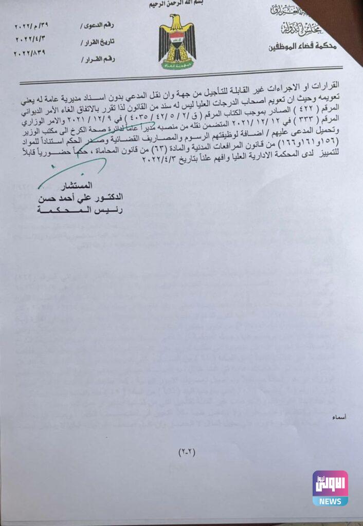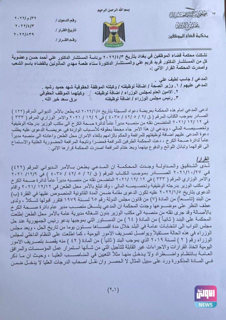 والغت المحكمة بحسب وثيقة حصلت عليها وكالة شفق نيوز، “قرار وزير الصحة هاني العقابي بنقل الحجامي الى مقر الوزارة”.