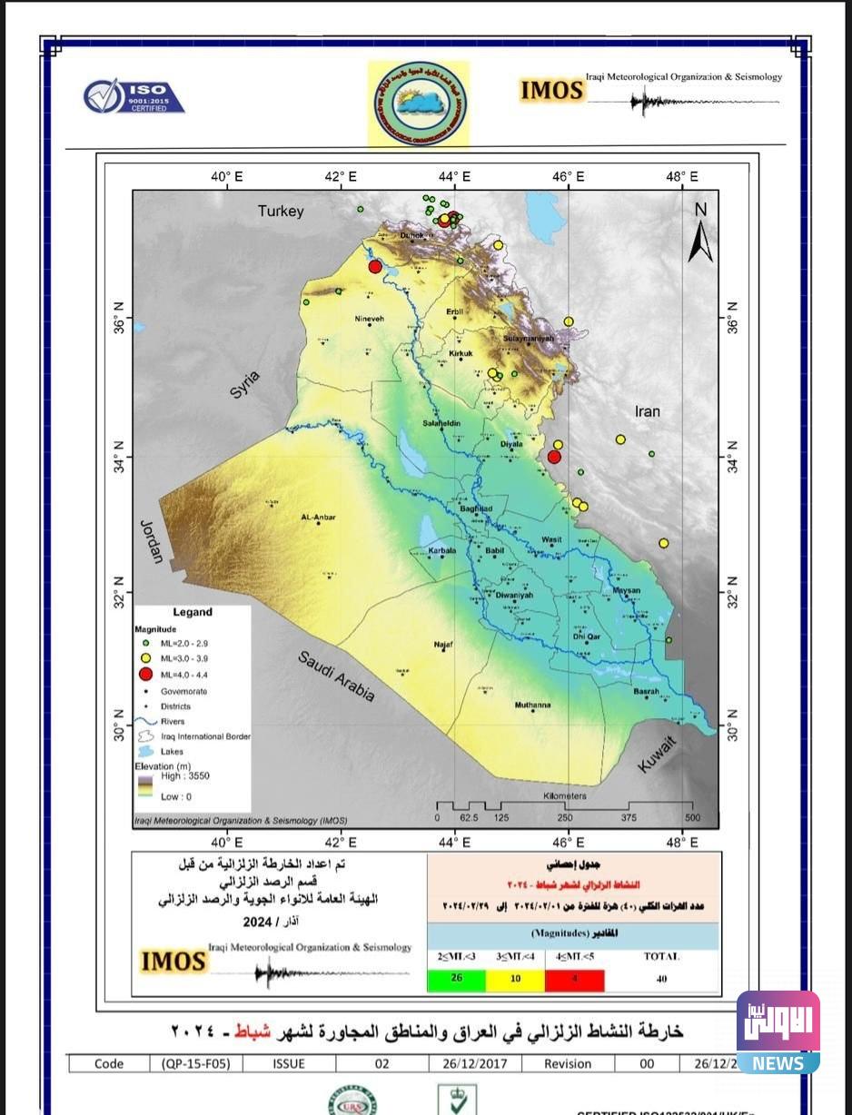 وقال مدير عام الهيئة العامة للأنواء الجوية والرصد الزلزالي عبد العظيم الساعدي في بيان تلقته (الاولى نيوز)، أن “شبكة الرصد الزلزالي سجلت (40) هزة أرضية، (10) منها داخل الاراضي العراقية و(٣٠) هزة في الدول المجاورة”.