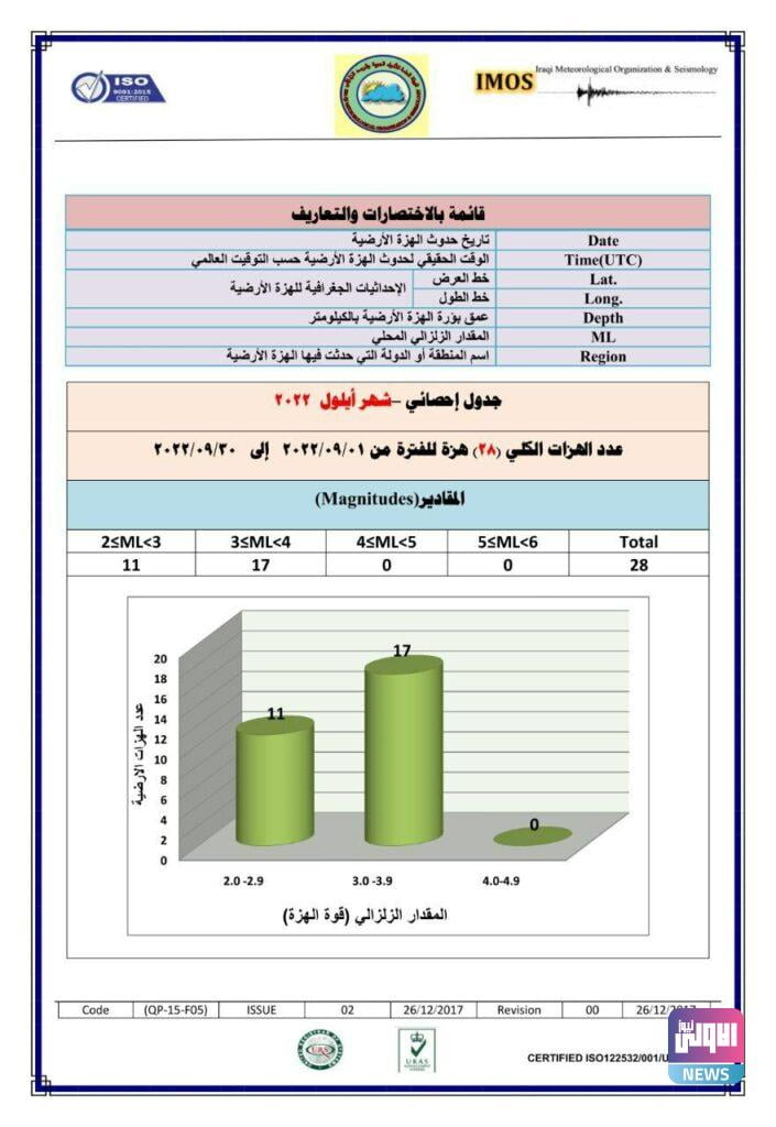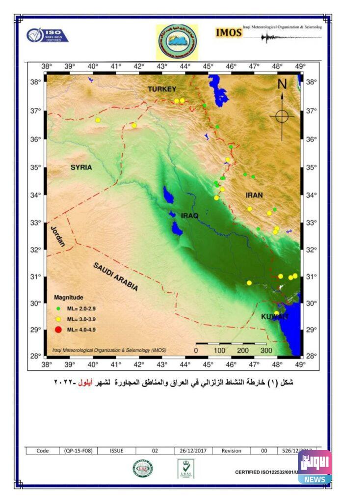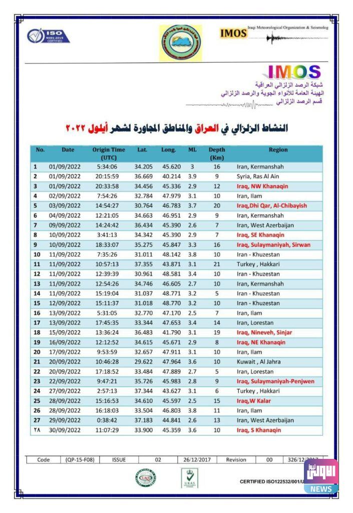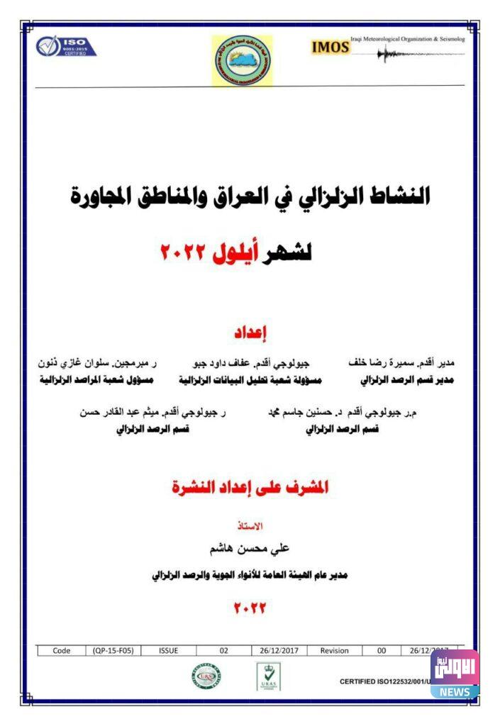 وجاء في تقرير للهيئة، تلقته (الاولى نيوز)، أن “قسم الرصد الزلزالي أصدر التقرير الشهري الخاص بالنشرة الزلزالية الشهرية في العراق والمناطق المجاورة لشهر أيلول 2022”.