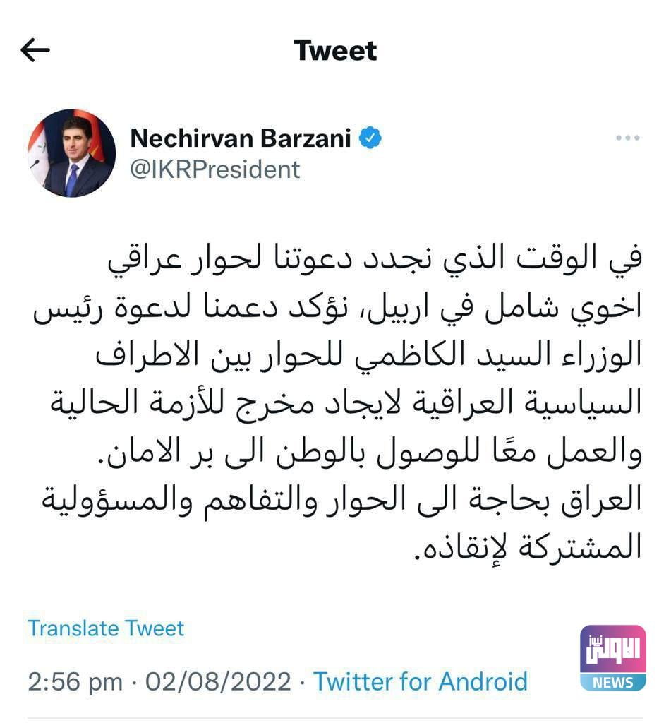 وقال بارزاني في تغريدة تابعتها (الاولى نيوز)، انه “في الوقت الذي نجدد دعوتنا لحوار عراقي اخوي شامل في اربيل، نؤكد دعمنا لدعوة رئيس الوزراء مصطفى الكاظمي للحوار بين الاطراف السياسية العراقية لإيجاد مخرج للأزمة الحالية والعمل معًا للوصول بالوطن الى بر الامان”.