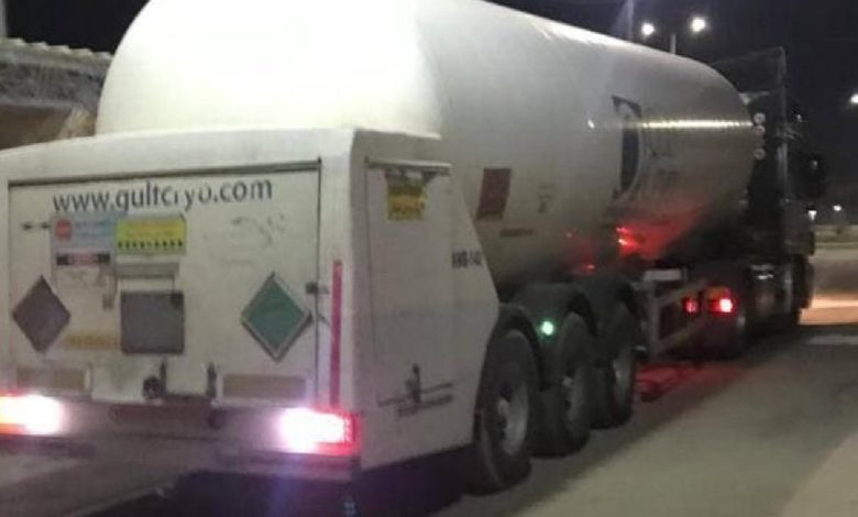 أعلنت هيئة المنافذ الحدودية، الثلاثاء، عن دخول غاز الأوكسجين الطبي السائل بواقع (12) صهاريج بحمولة إجمالية (240 طن) قادماً من دولة الكويت.
