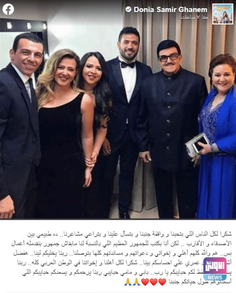 وفي منشور على صفحتها الشخصية في “فيسبوك”، قالت دنيا سمير غانم: “شكرا لكل الناس اللي بتحبنا وواقفة جنبنا وبتسأل علينا وبتراعي مشاعرنا.. ده طبيعي بين الأصدقاء والأقارب”.