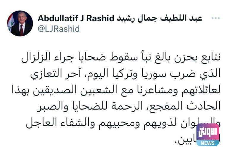 قدم رئيس الجمهورية عبد اللطيف رشيد، اليوم الاثنين، التعازي بضحايا الزلزال الذي ضرب سوريا وتركيا.