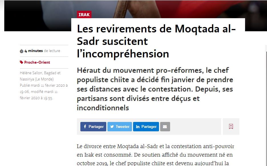 سلطت صحيفة “Le Temps” السويسرية الضوء على مواقف زعيم التيار الصدري مقتدى الصدر، وقراراته التي وصفتها بانها “مثيرة للجدل” حيال الاحتجاجات والتظاهرات الأخيرة التي انطلقت مطلع تشرين الأول الماضي، فيما أشارت إلى أن القطيعة بين الصدر والمتظاهرين باتت جلية.