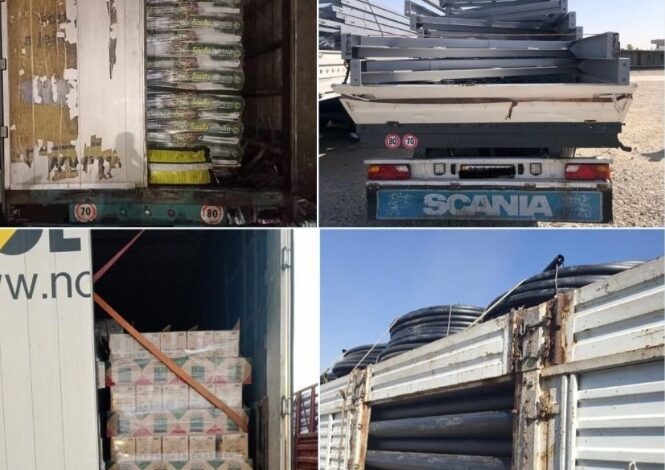 وقال بيان للهيئة تلقته (الاولى نيوز): إن” قسم التحري ومكافحة التهريب في مديرية كمرك المنطقة الشمالية ضبط 41 إرسالية محملة بـــ(مستلزمات طبية وأسمدة نباتية و أدوات احتياطية وأنابيب حديد و أنابيب بلاستيك وإطارات السيارات وحامض الستريك ونايلون وملابس مختلفة ومركزات ومكائن ومضخات متكاملة وفحم وسقوف ثانوية وصحيات مختلفة ولباد ومنظفات مختلفة وسجاد ميكانيكي ومواد غذائية وصبغ شعر وخام الحديد وإنشائية مختلفة وحديد ودهن ومحركات ومولدات كهرباء وكهربائيات مختلفة وألواح بلاستيك) ومواد متنوعة أخرى مخالفة للشروط والضوابط الاستيرادية النافذة”.