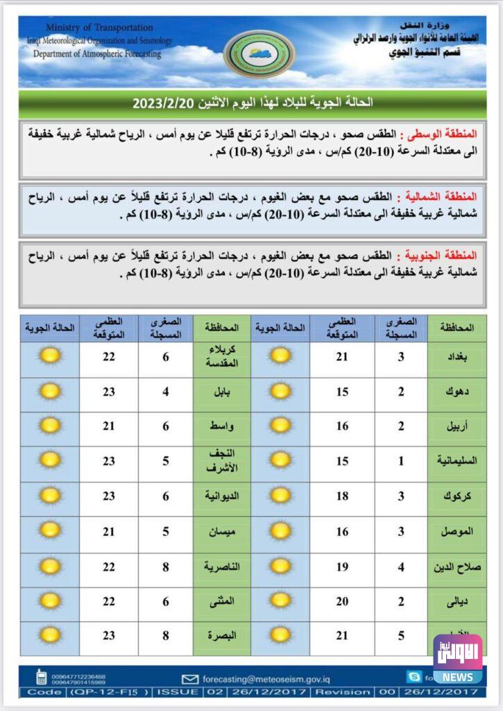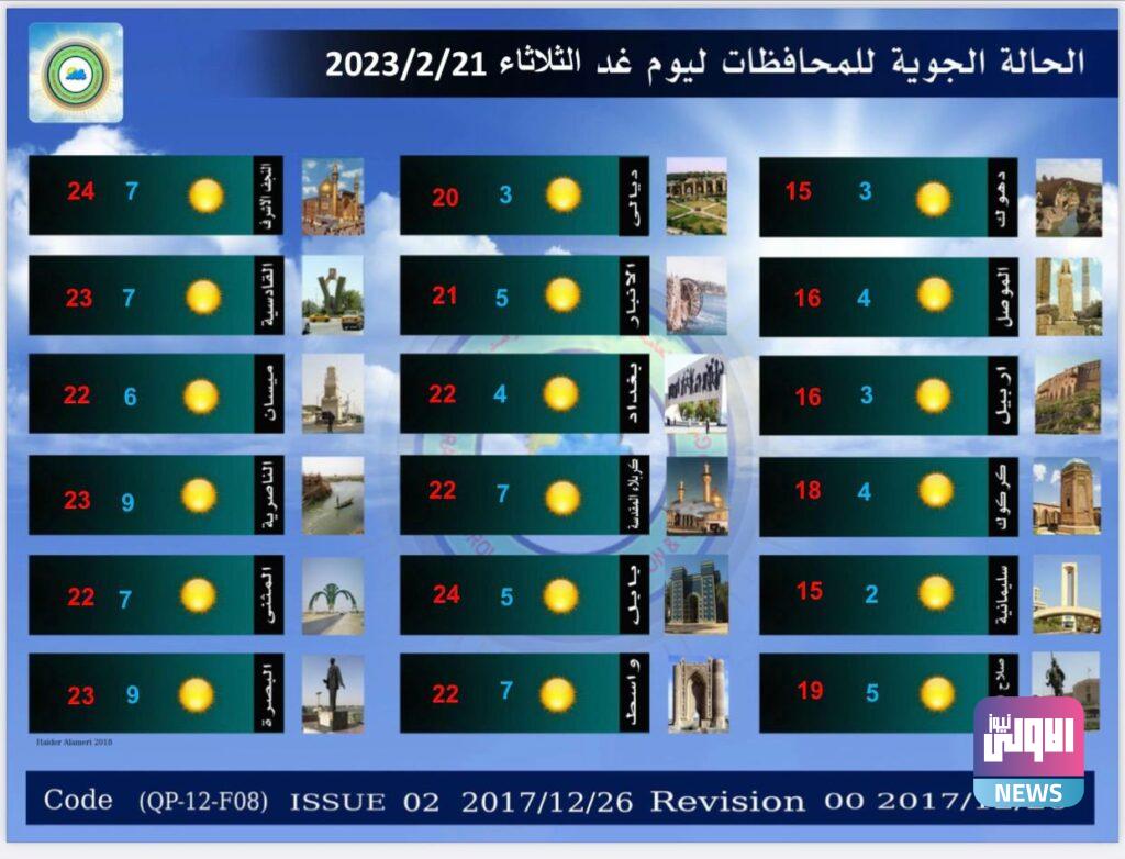 وفي أدناه جدول بدرجات الحرارة ليوم غد الثلاثاء وحالة الطقس للأيام المقبلة بحسب ما نشرته هيئة الأنواء الجوية: