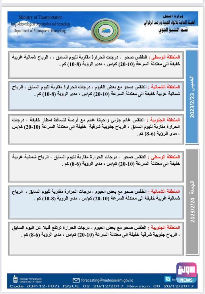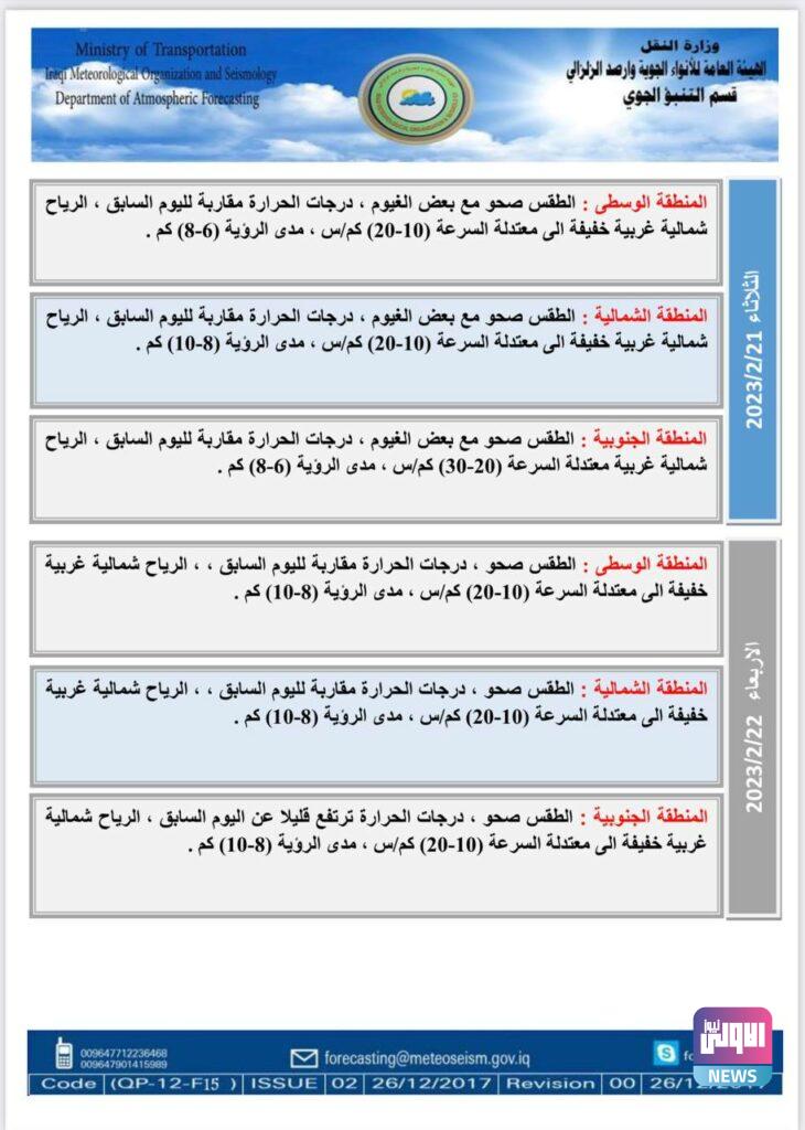وأضاف البيان، أن “طقس يوم الأربعاء سيكون صحواً في جميع مناطق البلاد، أما درجات الحرارة فستكون مقاربة لليوم السابق في الأقسام الوسطى والشمالية، فيما سترتفع قليلاً عن اليوم السابق في القسم الجنوبي من البلاد”.