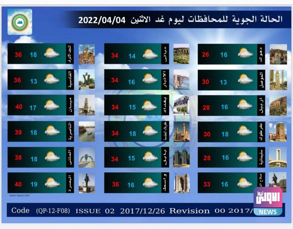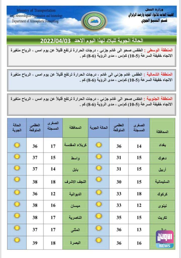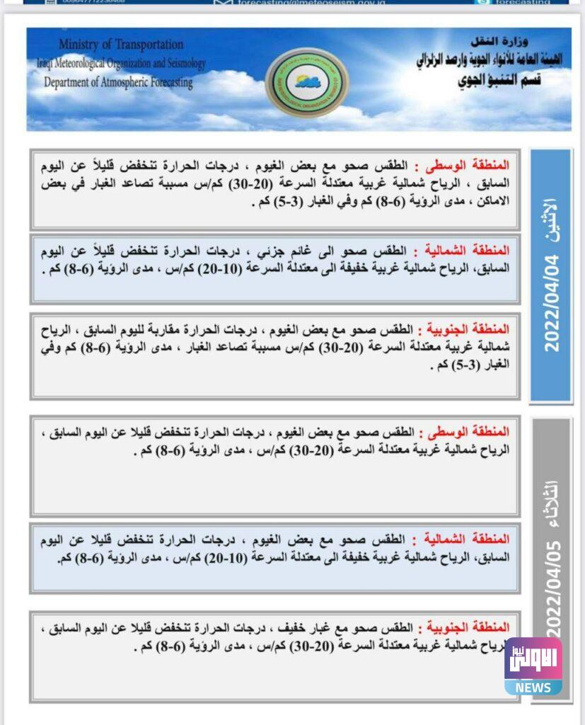 أعلنت هيئة الأنواء الجوية، اليوم الأحد، عن حالة الطقس في البلاد للأيام المقبلة، فيما توقعت تصاعداً للغبار مع انخفاض في درجات الحرارة الأسبوع الحالي.