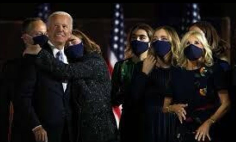 كان أطفال وأحفاد بايدن معه عندما علِم أنه حصل على الـ270 صوتاً انتخابياً اللازمة للفوز بالرئاسة في نوفمبر/تشرين الثاني. وتشاركت العائلة كلها عناقاً احتفالياً بعد إعلان النصر.