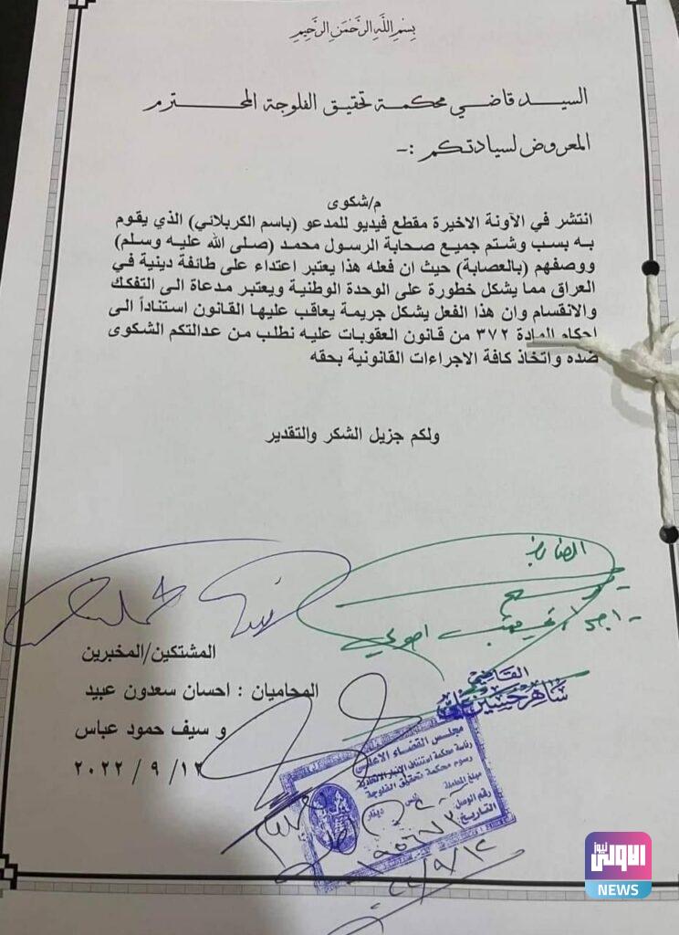 وفي وثيقة حصلت (الاولى نيوز)، على نسخة من الدعوى التي رفعها المحاميان (احسان سعدون وسيف حمود)، وجاء فيها: “انتشر في الآونة الأخيرة مقطع فيديو للمدعو (باسم الكربلائي) الذي يقوم به بسب وشتم جميع صحابة الرسول محمد (صلى الله عليه وسلم) ووصفهم بـ (العصابة) حيث أن فعله هذا يعتبر اعتداء على طائفة دينية في العراق مما يشكل خطورة على الوحدة الوطنية ويعتبر مدعاة الى التفكك والانقسام”.
