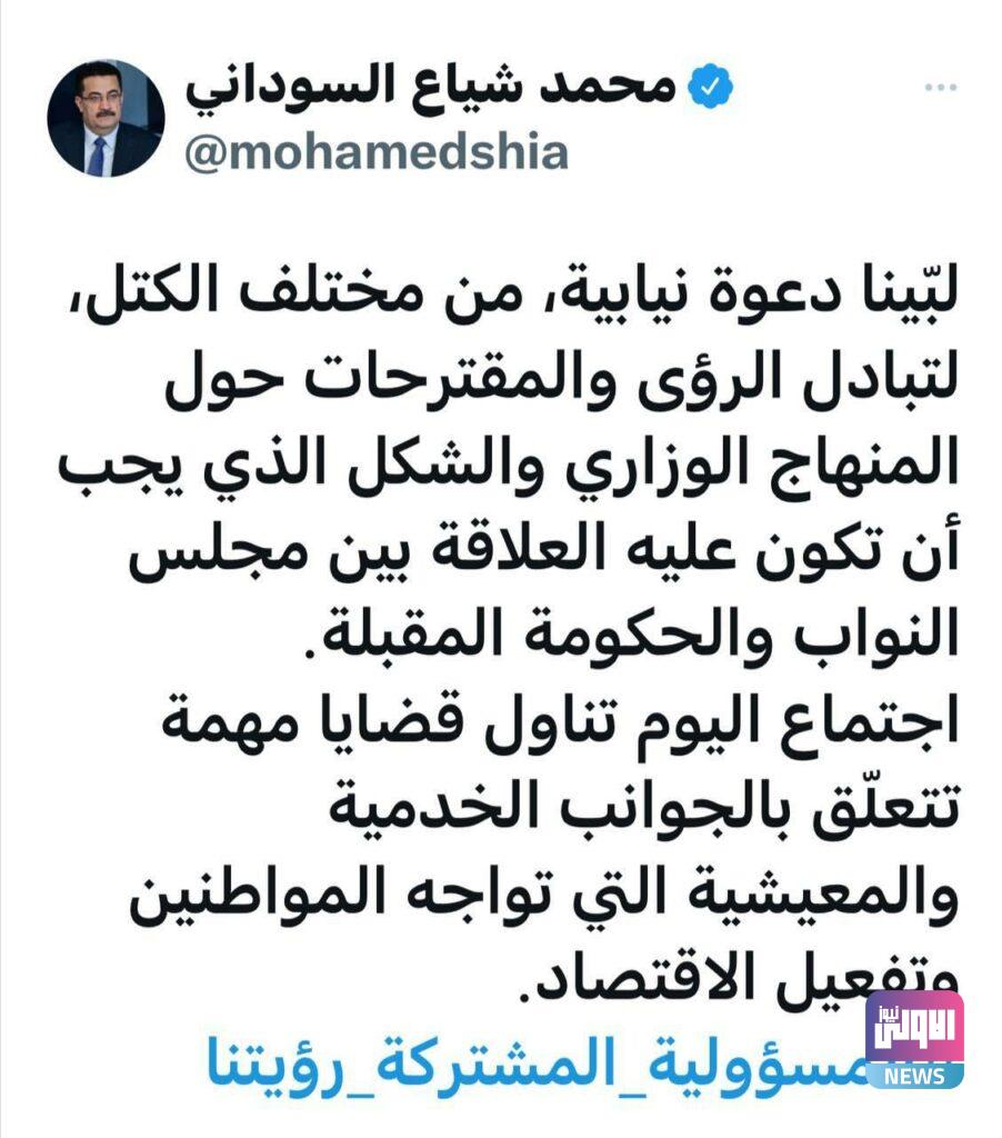 وقال السوداني في تغريدة تابعها (الاولى نيوز)، “لبّينا دعوة نيابية، من مختلف الكتل، لتبادل الرؤى والمقترحات حول المنهاج الوزاري والشكل الذي يجب أن تكون عليه العلاقة بين مجلس النواب والحكومة المقبلة”.