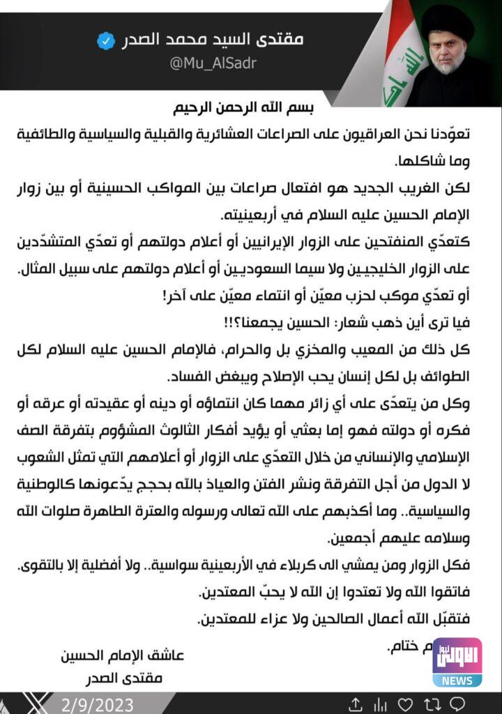 وقال الصدر في بيان تلقته (الاولى نيوز): “تعودنا نحن العراقيين على الصراعات العشائرية والقبلية والسياسية والطائفية وما شاكلها، لكن الغريب الجديد هو افتعال صراعات بين المواكب الحسينية أو بين زوار الإمام الحسين عليه السلام في أربعينيتهِ كتعدي المنفتحين على الزوار الإيرانيين أو أعلام دولتهم أو تعدي المتشددين على الزوار الخليجيين ولا سيما السعوديين أو أعلام دولتهم على سبيل المثال، أو تعدّي موكب لحزب معيّن أو انتماء معيّن على آخر”.