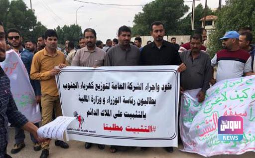 تظاهر عدد من موظفي العقود والاجراء اليوميين في وزارة الكهرباء بمحافظة البصرة، الثلاثاء، للمطالبة بدفع مستحقاتهم المالية المتأخرة منذ اشهر عدة.وقال مراسل /موازين نيوز/ في المحافظة، ان “عددا من موظفي عقود الكهرباء والاجراء اليوميين، تظاهروا امام مبنى شركة نقل الطاقة الكهربائية في الجنوب، للمطالبة بصرف رواتبهم المتأخرة منذ 10 أشهر”.واشار مراسلنا إلى “المتظاهرين أكدوا بان تعيينهم تم ضمن حزمة الإصلاحات وبموافقة مجلس الوزراء باعتبار ان الوزارة ممولة ذاتيا، مطالبين بصرف مستحقاتهم المالية، لتجنب الوصول الى الخطوات التصعيدية وتنظيم إضراب عام عن العمل”.ولفت إلى ان “المحتجين طالبوا الحكومة بحل مشكلتهم المتمثلة بصرف رواتبهم، مهددين باللجوء الى محكمة العمل في حال لم يتم الاستجابة لتلك المطالب”.
