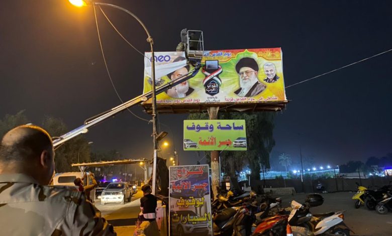 ورفعت جهة مجهولة مساء الأربعاء لافتة ضمت صور كلٍ من قاسم سليماني، وعلي خامنئي، وروح الله الخميني على بعد أمتار من مرقد الإمام أبو حنيفة النعمان.