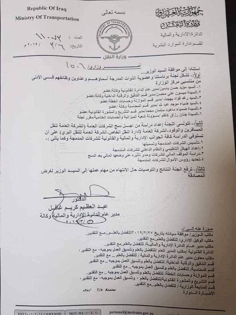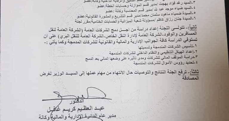 وبينت الوثيقة التي حصلت الاولى نيوز على نسخة منها أن “الشركات الثلاث، هي الشركة العامة لنقل المسافرين والوفود والشركة العامة لإدارة النقل الخاص والشركة العامة للنقل البري”، موضحة أن على اللجنة إعداد دراسة مستوفية للجوانب الإدارية والمالية والقانونية المتعلقة بإجراءات الدمج.