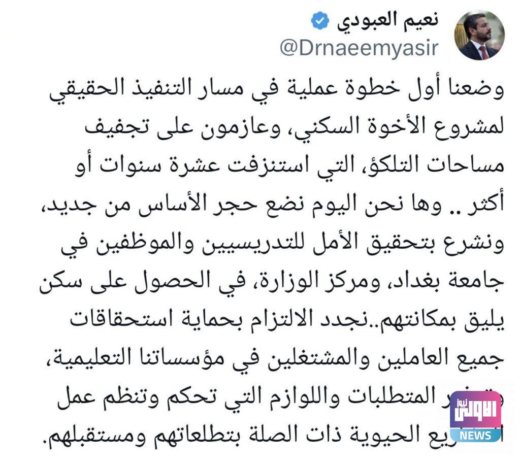 وقال العبودي في تدوينة له على موقع(x)، تابعتها (الاولى نيوز): “وضعنا أول خطوة عملية في مسار التنفيذ الحقيقي لمشروع الأخوة السكني، وعازمون على تجفيف مساحات التلكؤ، التي استنزفت عشرة سنوات أو أكثر، وها نحن اليوم نضع حجر الأساس من جديد، ونشرع بتحقيق الأمل للتدريسيين والموظفين في جامعة بغداد، ومركز الوزارة، في الحصول على سكن يليق بمكانتهم”.