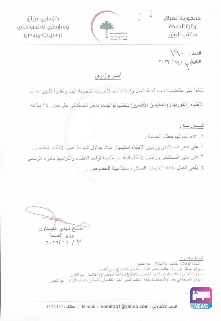 وزير الصحة يصدر امراً وزارياً بخصوص عمل الاطباء (الدوريين والمقيمين الاقدمين) (وثيقة)