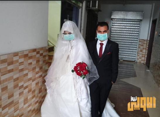 وارتدت العروس فستانها الأبيض، وغطت وجهها بكمامة طبية وكذلك ارتدى العريس بدلته ومعها الكمامة، والتف حولهم عدد من الأصدقاء يغنون ويرقصون.