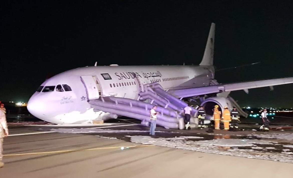 وأضاف البيان:”إنه أثناء الرحلة تعرضت الطائرة لخلل فني في منظومة (الهيدروليك) ما استدعى تغيير مسارها والتوجه لمطار الملك عبدالعزيز الدولي بجدة” حيث هبطت من دون نزول العجلات الأمامية وتوقفت في نهاية المدرج ” .