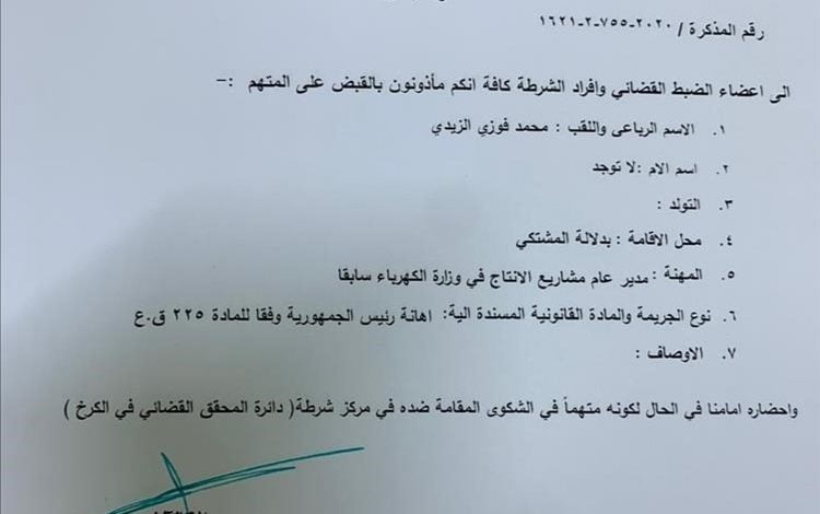 وحصل المصدر الذي اطلعت عليه (الاولى نيوز) ، على وثيقة صادرة من مجلس القضاء الأعلى، تضمنت مذكرة قبض بحق، مدير عام عام مشاريع الانتاج في وزارة الكهرباء سابقا،