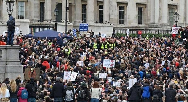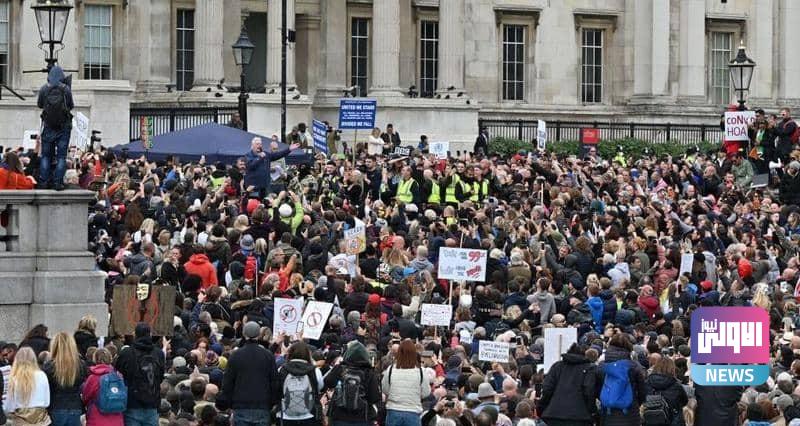 تظاهر الآلاف، السبت، في ساحة الطرف الأغر بلندن، احتجاجا على إجراءات التباعد الاجتماعي والإغلاق، التي أعادت السلطات فرضها في البلاد مع تزايد الإصابات بفيروس كورونا.