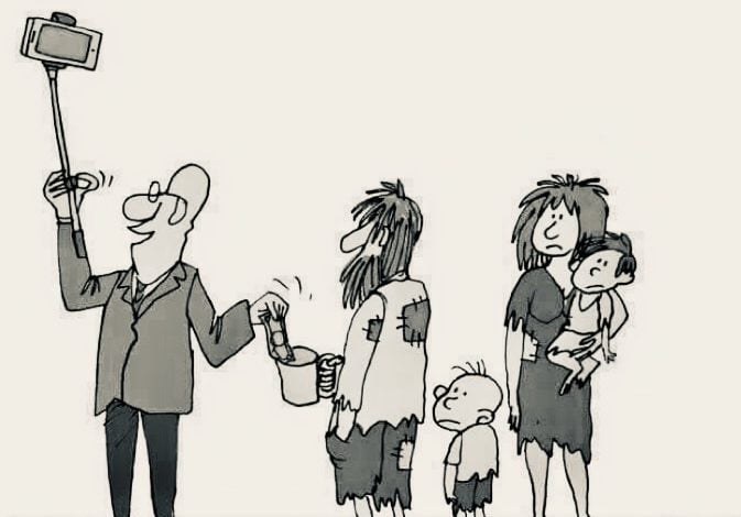 حتى هوَ لا يصدق بأنه قام بمساعدة انسان او اعطى لمحتاج او اشبع جائع فنراهم يهرعون لمواقع التواصل الاجتماعي كلها ليوثقو هذا الخبر ! رغم ان ما يفرقهم فقط طبقة اجتماعية لا غير فهم يرون انفسهم اسياد وهو الفقير الجائع الذي يبحث عن قوت يومه بتعب .