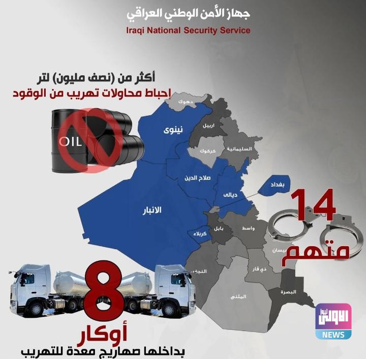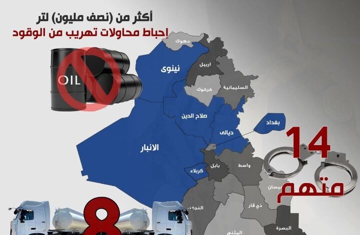 وأضاف أن “عمليات الضبط جرت في محافظات (بغداد، والأنبار، وديالى، وصلاح الدين، ونينوى، وكربلاء) وأسفرت أيضاً عن مداهمة (8) أوكار ضمت بداخلها صهاريج معدة للتهريب، فضلاً عن القبض على (14) متهماً وفق مذكرات قبض قضائية”.