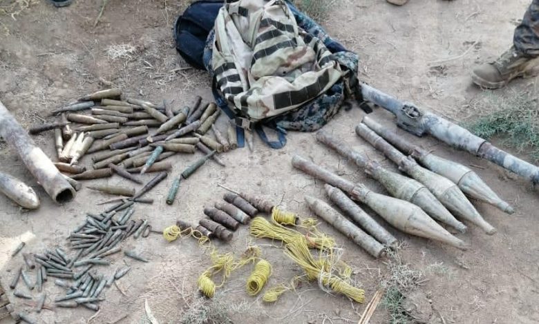 وأضاف البيان، انه “تمت معالجة 6 صواريخ قاذفة، وهاون ١٨٠ ملم، و6 اسلاك تفخيخ عبوات ناسفة، و60 شريط عتاد رشاش عيار ١٤ ملم، و 123 اطلاقة عتاد رشاش BKC، وصاروخ هاون عيار ١٨٠ ملم ، وقد تمت المعالجة وفق الاجراءات القياسية”.