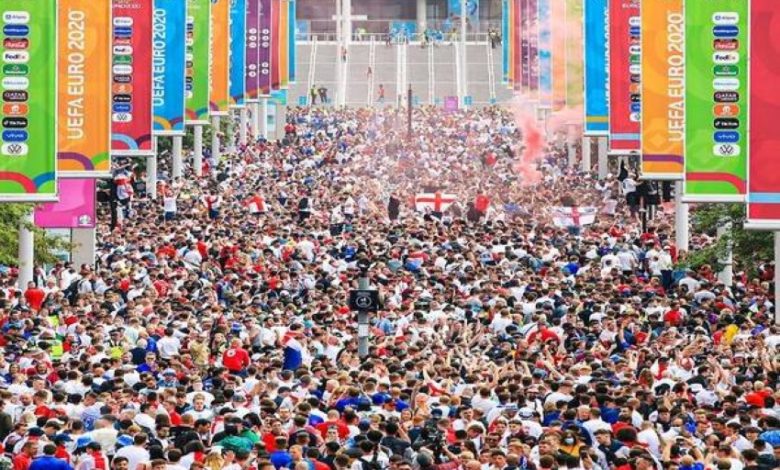 وأشارت التقديرات إلى تواجد قرابة 200 ألف مشجع خارج «ويمبلي» في وقت سُمِحَ بحضور 67500 شخص في المدرجات للمرة الأولى بهذا العدد منذ تفشي فيروس كورونا في مارس 2020.