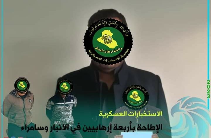 أعلنت مديرية الاستخبارات العسكرية التابعة لوزارة الدفاع، اليوم الاربعاء، الإطاحة بأربعة إرهابيين في الأنبار وسامراء.