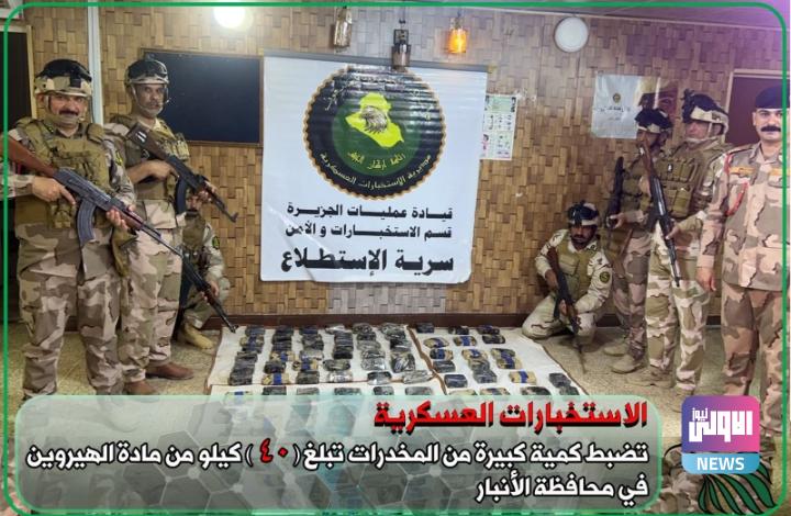 أعلنت مديرية الاستخبارات العسكرية، اليوم الثلاثاء، ضبط 40 كيلوغراما من الهيرويين في الأنبار.