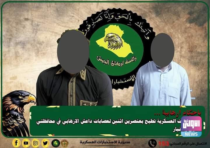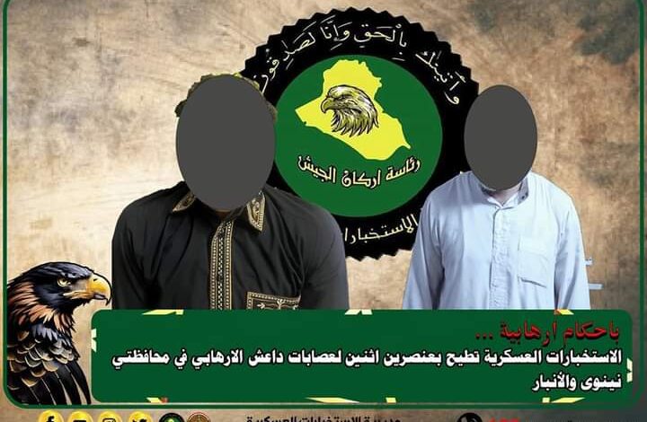اعلنت مديرية الاستخبارات العسكرية، اليوم الثلاثاء، عن الإطاحة باثنين من عصابات داعش في نينوى والأنبار.